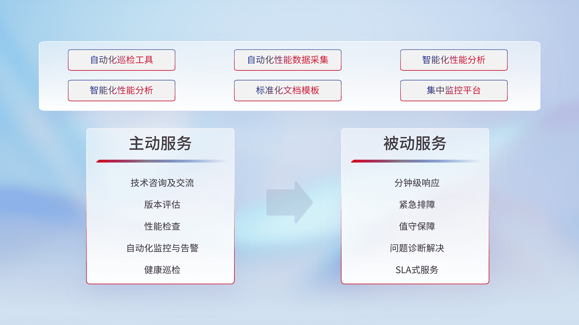 智能化工具和标准化文档,,,,保障服务质量,,提供主动服务(包含技术咨询、、、版本评估、、、、性能检查、、、、自动化监控与告警、、健康巡检)和被动服务包含(分钟级响应、、、紧急排障、、、、值守保障、、问题诊断解决、、、SLA服务)。。